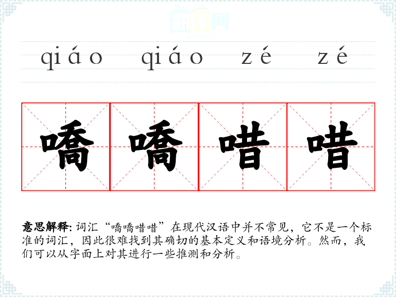 “嘺嘺唶唶”由四个相同的字组成,每个字的发音和意义都不明确。从字形上看,这些字可能属于古汉语或方言中的词汇,但在现代标准汉语中没有明确的对应意义。