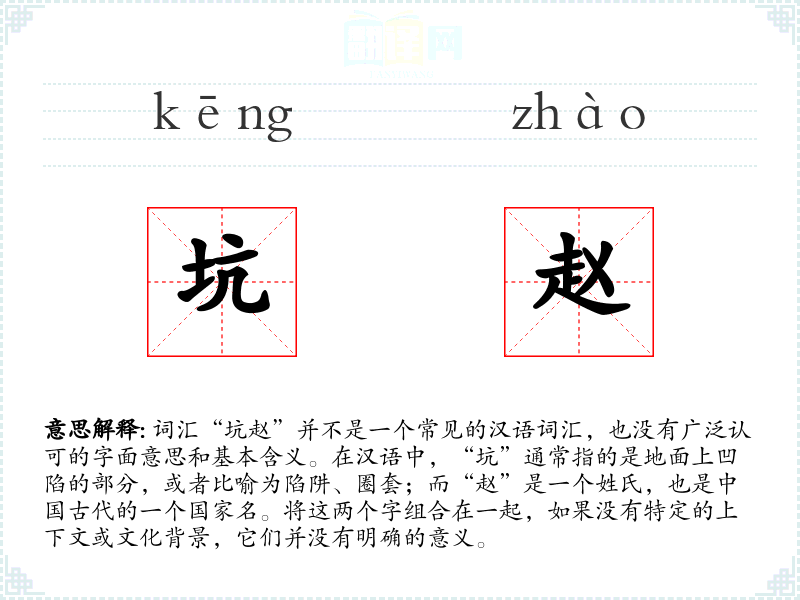 词源与演变: 由于“坑赵”不是一个标准的词汇,它的词源和历史演变无从谈起。