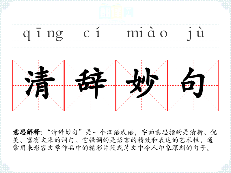 “清辞妙句”是一个汉语成语,字面意思指的是清新、优美、富有文采的词句。它强调的是语言的精致和表达的艺术性,通常用来形容文学作品中的精彩片段或诗文中令人印象深刻的句子。