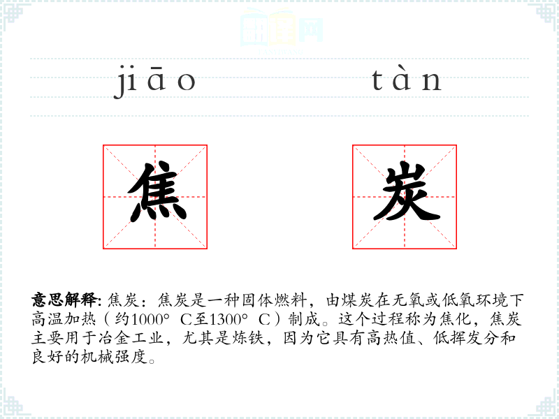 - 同义词:焦煤(在某些情况下可以互换使用,但焦煤更侧重于煤炭的种类)