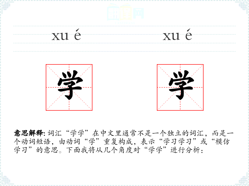 “学学”字面意思是进行学的行为,强调的是一种模仿或初步学的状态。