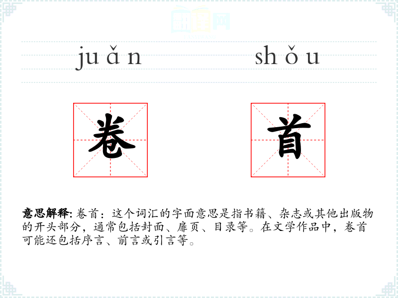 卷首:这个词汇的字面意思是指书籍、杂志或其他出版物的开头部分,通常包括封面、扉页、目录等。在文学作品中,卷首可能还包括序言、前言或引言等。