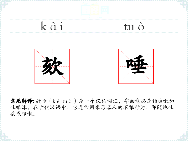 欬唾(ké tuò)是一个汉语词汇,字面意思是指咳嗽和吐唾沫。在古代汉语中,它通常用来形容人的不雅行为,即随地吐痰或咳嗽。