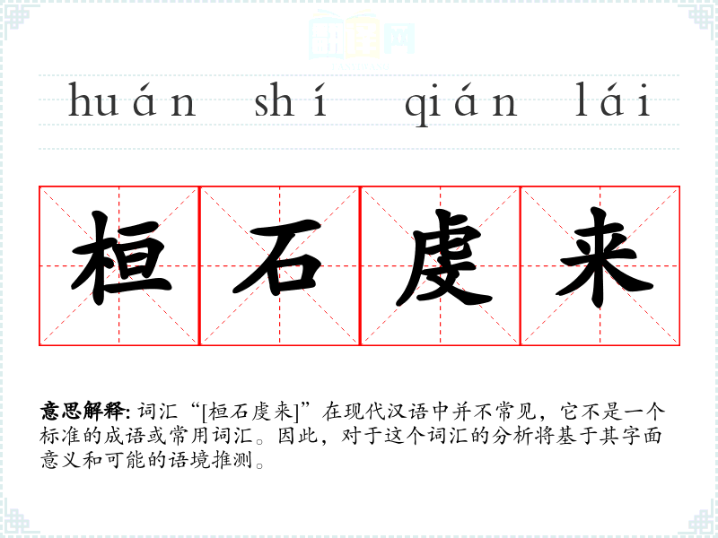 词汇“[桓石虔来]”在现代汉语中并不常见,它不是一个标准的成语或常用词汇。因此,对于这个词汇的分析将基于其字面意义和可能的语境推测。