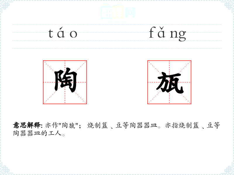 亦作"陶旊"; 烧制簋﹑豆等陶器器皿。亦指烧制簋﹑豆等陶器器皿的工人。