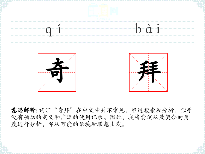 由于“奇拜”不是一个标准的汉语词汇,我们无法给出一个确切的基本定义。它可能是某个特定领域或方言中的词汇,或者是拼写错误或打字错误。