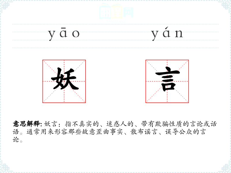 妖言:指不真实的、迷惑人的、带有欺骗性质的言论或话语。通常用来形容那些故意歪曲事实、散布谣言、误导公众的言论。