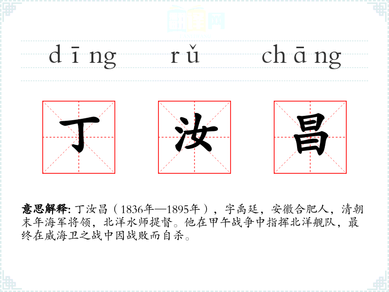 的名字来源于传统的命名惯,其中“丁”是姓氏,“汝昌”是名字。在语言中,他的名字主要用于指代这位历史人物,没有明显的词源演变。