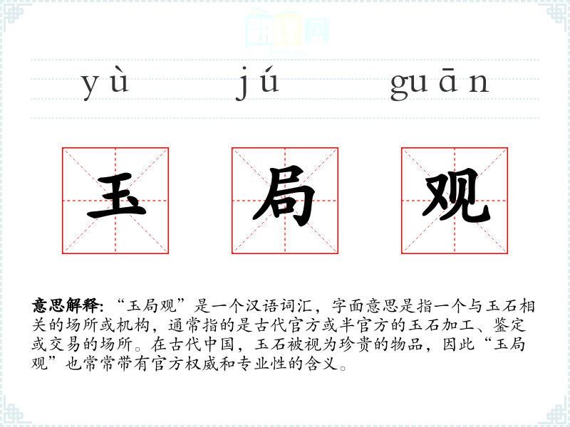 同义词:玉局、玉坊、玉室 反义词:无(由于“玉局观”是一个特定历史背景下的词汇,通常没有直接的反义词)