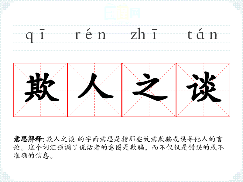 欺人之谈 的字面意思是指那些故意欺骗或误导他人的言论。这个词汇强调了说话者的意图是欺骗,而不仅仅是错误的或不准确的信息。