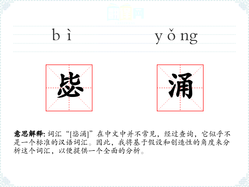 词汇“[毖涌]”在中文中并不常见,经过查询,它似乎不是一个标准的汉语词汇。因此,我将基于假设和创造性的角度来分析这个词汇,以便提供一个全面的分析。