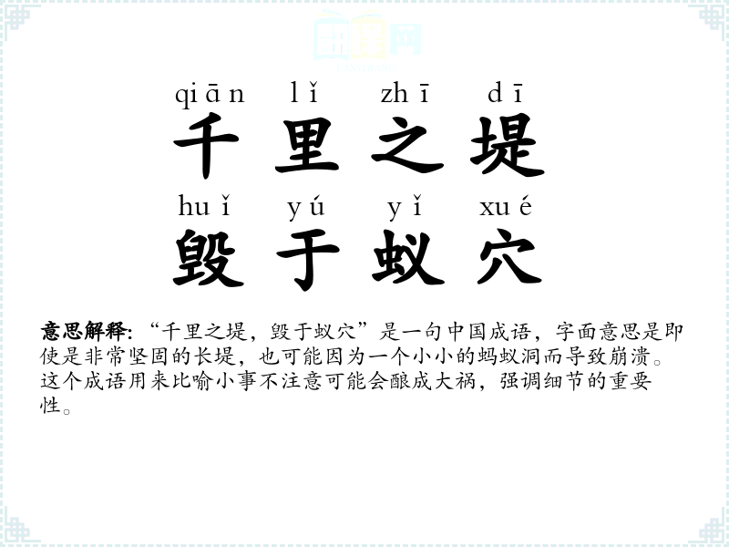 - 老师经常告诫我们:“千里之堤,毁于蚁穴”,意思是让我们不要忽视学*中的小错误。