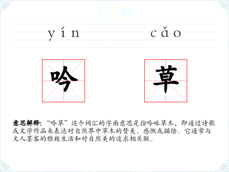 在文化中,“吟草”与文人墨客的生活态度和审美追求紧密相关,反映了古代文人对自然美的崇尚和对生活品质的追求。它也是传统文化中“天人合一”思想的一种体现。