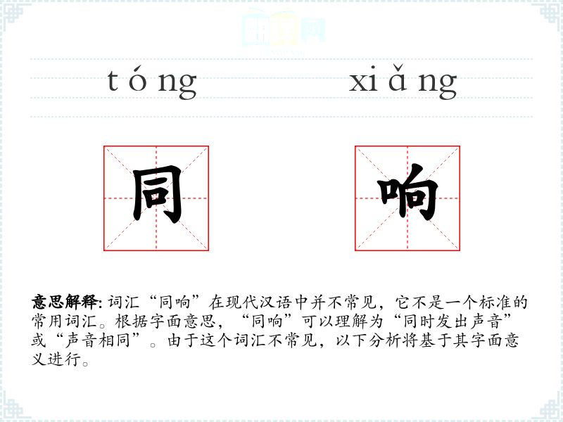 词汇“同响”在现代汉语中并不常见,它不是一个标准的常用词汇。根据字面意思,“同响”可以理解为“同时发出声音”或“声音相同”。由于这个词汇不常见,以下分析将基于其字面意义进行。