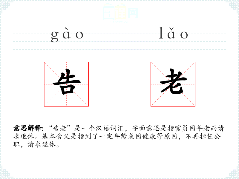 “告老”是一个汉语词汇,字面意思是指官员因年老而请求退休。基本含义是指到了一定年龄或因健康等原因,不再担任公职,请求退休。