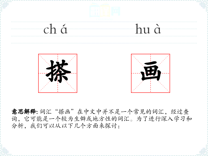 词汇“搽画”在中文中并不是一个常见的词汇,经过查询,它可能是一个较为生僻或地方性的词汇。为了进行深入学习和分析,我们可以从以下几个方面来探讨:
