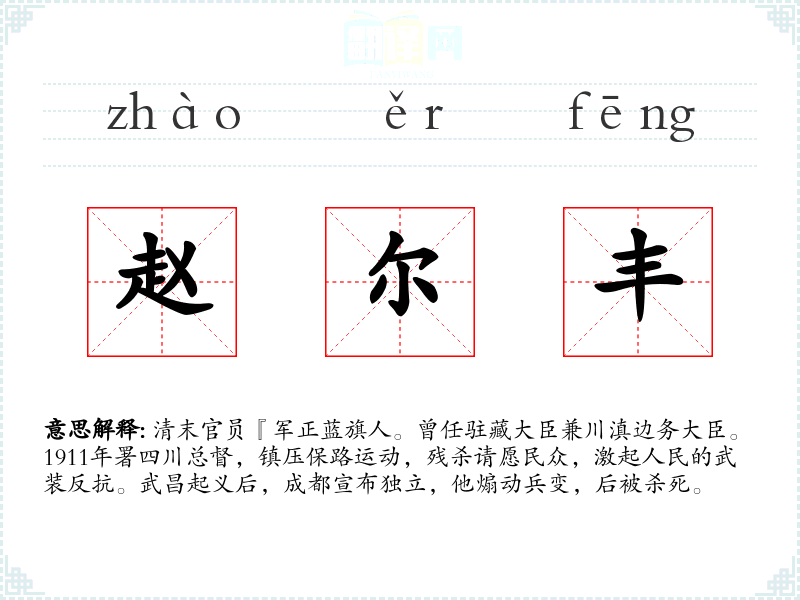 清末官员『军正蓝旗人。曾任驻藏大臣兼川滇边务大臣。1911年署四川总督,镇压保路运动,残杀请愿民众,激起人民的武装反抗。武昌起义后,成都宣布独立,他煽动兵变,后被杀死。