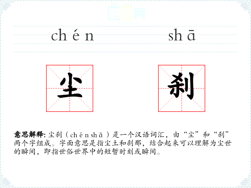 尘刹(chén shā)是一个汉语词汇,由“尘”和“刹”两个字组成。字面意思是指尘土和刹那,结合起来可以理解为尘世的瞬间,即指世俗世界中的短暂时刻或瞬间。