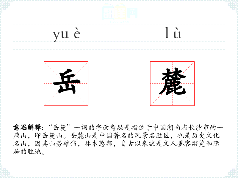 “岳麓”一词的字面意思是指位于湖南省长沙市的一座山,即岳麓山。岳麓山是著名的风景名胜区,也是历史文化名山,因其山势雄伟,林木葱郁,自古以来就是文人墨客游览和隐居的胜地。