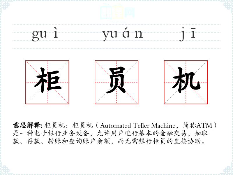 - 词源:柜员机一词源自英文“Automated Teller Machine”,缩写为ATM。