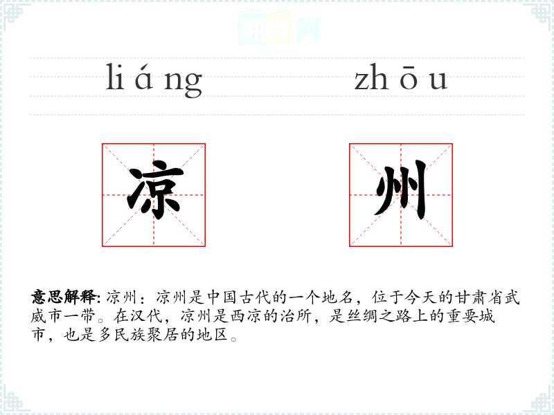 凉州:凉州是**古代的一个地名,位于今天的甘肃省武威市一带。在汉代,凉州是西凉的治所,是丝绸之路上的重要城市,也是多民族聚居的地区。