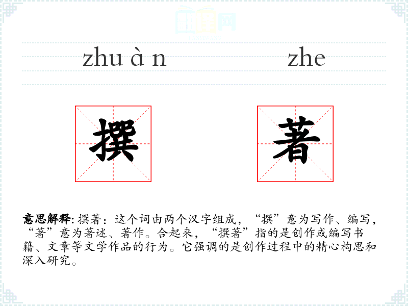 撰著:这个词由两个汉字组成,“撰”意为写作、编写,“著”意为著述、著作。合起来,“撰著”指的是创作或编写书籍、文章等文学作品的行为。它强调的是创作过程中的精心构思和深入研究。