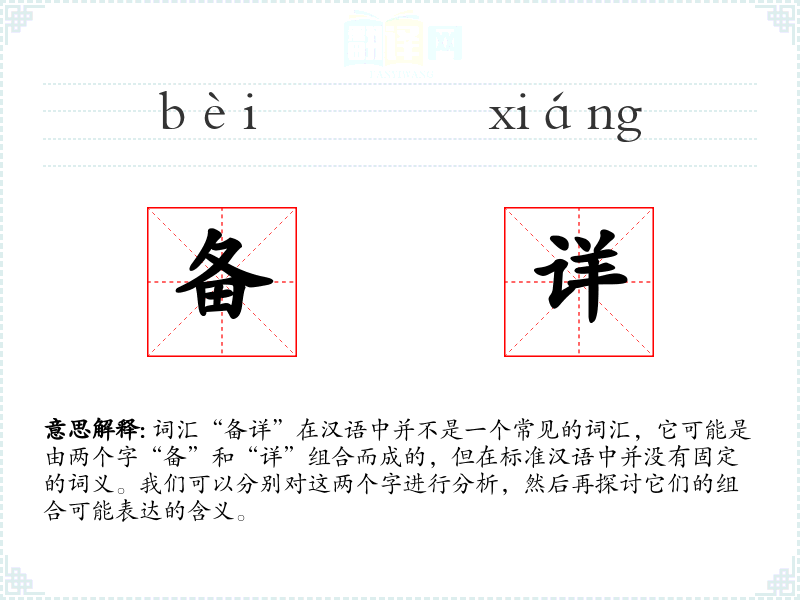 词汇“备详”在汉语中并不是一个常见的词汇,它可能是由两个字“备”和“详”组合而成的,但在标准汉语中并没有固定的词义。我们可以分别对这两个字进行分析,然后再探讨它们的组合可能表达的含义。