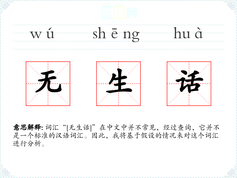 词汇“[无生话]”在中文中并不常见,经过查询,它并不是一个标准的汉语词汇。因此,我将基于假设的情况来对这个词汇进行分析。