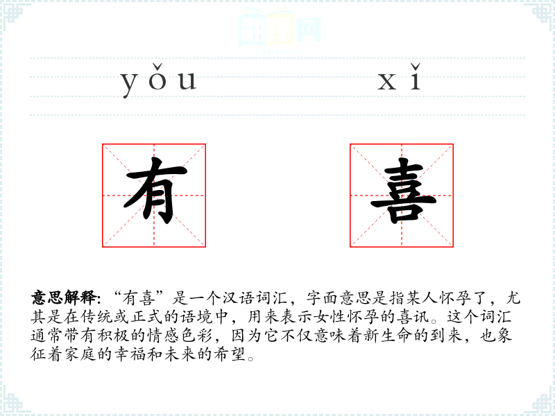 “有喜”是一个汉语词汇,字面意思是指某人怀孕了,尤其是在传统或正式的语境中,用来表示女性怀孕的喜讯。这个词汇通常带有积极的情感色彩,因为它不仅意味着新生命的到来,也象征着家庭的幸福和未来的希望。