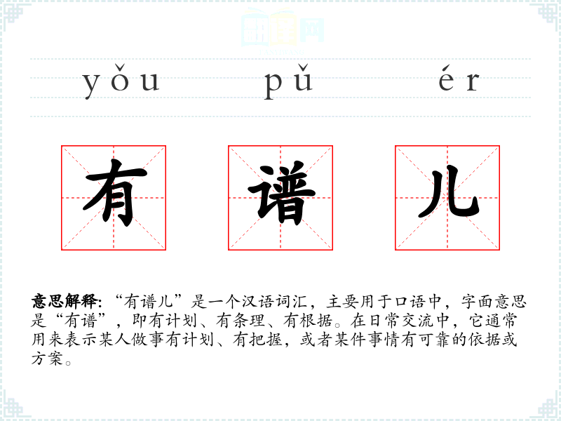“有谱儿”是一个汉语词汇,主要用于口语中,字面意思是“有谱”,即有计划、有条理、有根据。在日常交流中,它通常用来表示某人做事有计划、有把握,或者某件事情有可靠的依据或方案。