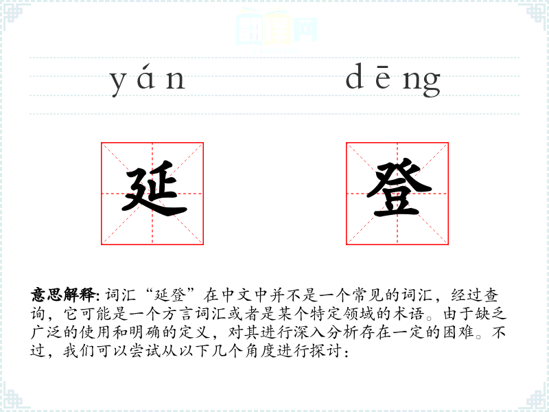 由于“延登”不是一个标准汉语词汇,我们无法给出一个确切的字面意思和基本含义。它可能是某个地方方言中的词汇,或者是某个专业领域的术语。