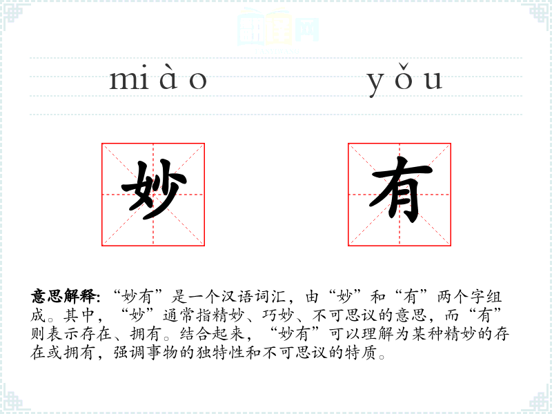 “妙有”是一个汉语词汇,由“妙”和“有”两个字组成。其中,“妙”通常指精妙、巧妙、不可思议的意思,而“有”则表示存在、拥有。结合起来,“妙有”可以理解为某种精妙的存在或拥有,强调事物的独特性和不可思议的特质。