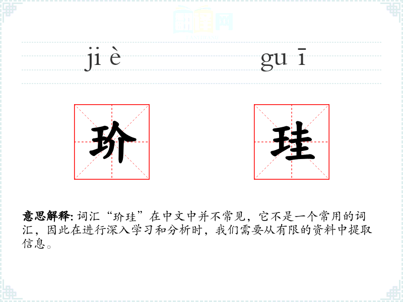 词汇“玠珪”在中文中并不常见,它不是一个常用的词汇,因此在进行深入学*和分析时,我们需要从有限的资料中提取信息。