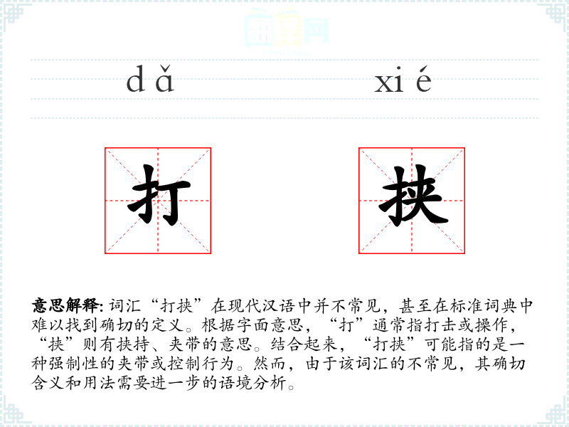 在特定的文化或社会背景中,“打挟”可能被用来描述某种强制性的行为或状态,但这种用法非常有限且不常见。