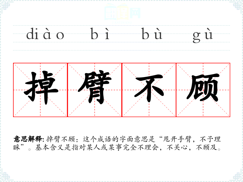 掉臂不顾:这个成语的字面意思是“甩开手臂,不予理睬”。基本含义是指对某人或某事完全不理会,不关心,不顾及。