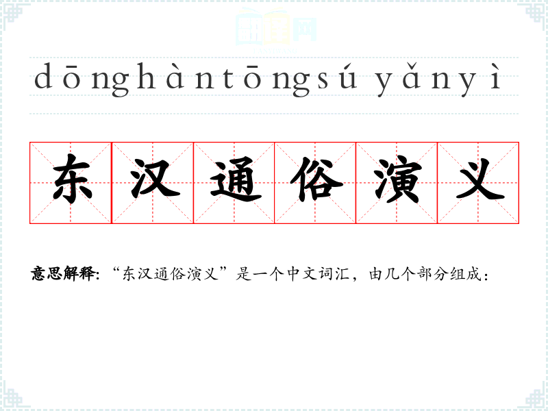 “东汉通俗演义”是一个中文词汇,由几个部分组成: