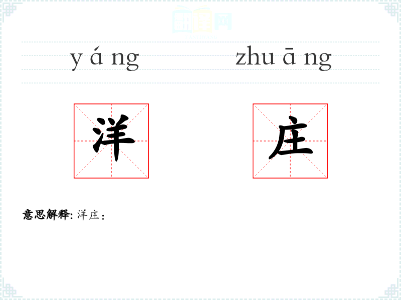 - 字面意思:字面上看,“洋庄”由“洋”和“庄”两个字组成。“洋”通常指外国的或与外国有关的,“庄”则可以指庄园、村庄或庄重等含义。