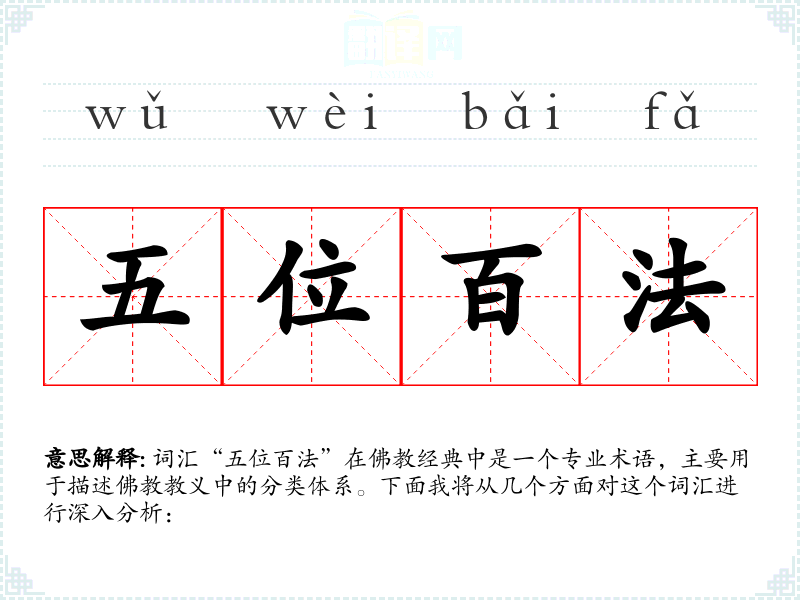 词汇“五位百法”在经典中是一个专业术语,主要用于描述教义中的分类体系。下面我将从几个方面对这个词汇进行深入分析: