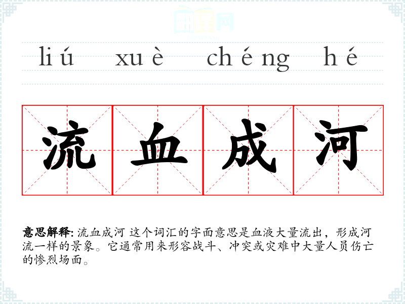 - 口语:在日常口语中,这个词汇可能被用来夸张地描述某个**的严重性,如“那场车祸真是流血成河”。