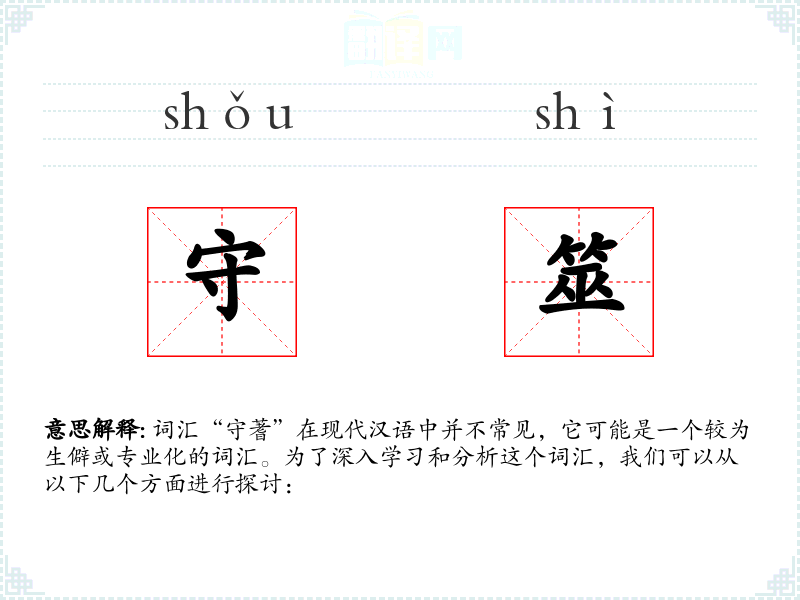 词汇“守蓍”在现代汉语中并不常见,它可能是一个较为生僻或专业化的词汇。为了深入学*和分析这个词汇,我们可以从以下几个方面进行探讨:
