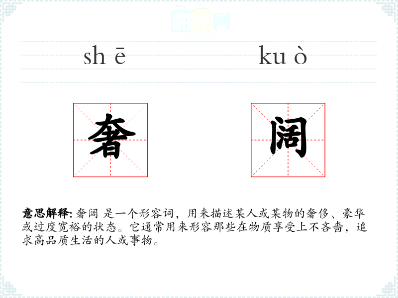 奢阔 是一个形容词,用来描述某人或某物的奢侈、豪华或过度宽裕的状态。它通常用来形容那些在物质享受上不吝啬,追求高品质生活的人或事物。