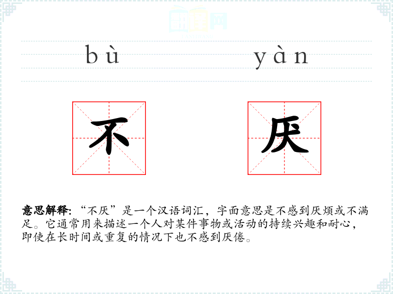 - 同义词:耐心、不懈、坚持、恒心。这些词汇都表达了持续努力和不放弃的态度,但“不厌”更强调的是内心的不厌倦感。