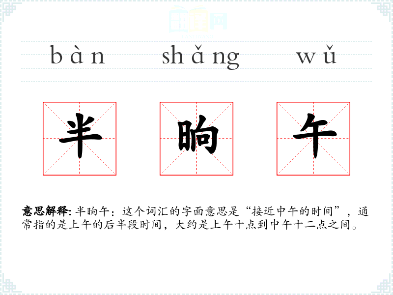 “半晌午”这个词源于汉语,由“半”和“晌午”组成。“晌午”原指中午,加上“半”表示接近中午的时间。在古代汉语中,时间的表达往往比较模糊,这个词体现了这种时间描述的特点。