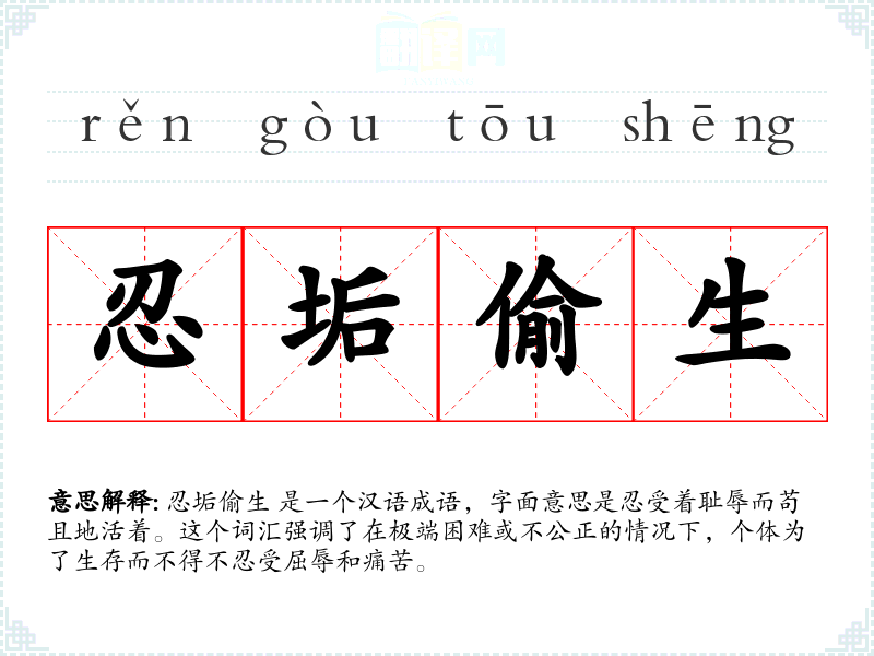 忍垢偷生 是一个汉语成语,字面意思是忍受着耻辱而苟且地活着。这个词汇强调了在极端困难或不公正的情况下,个体为了生存而不得不忍受屈辱和痛苦。