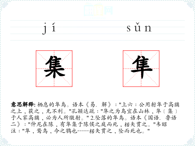 1.栖息的隼鸟。语本《易.解》﹕"上六﹕公用射隼于高牖之上﹐获之﹐无不利。"孔颖达疏﹕"隼之为鸟宜在山林﹐隼﹝集﹞于人家高牖﹐必为人所缴射。" 2.坠落的隼鸟。语本《国语.鲁语二》﹕"仲尼在陈﹐有隼集于陈侯之庭而死﹐楛矢贯之。"韦昭注﹕"隼﹐鸷鸟﹐今之鹗也……楛矢贯之﹐坠而死也。"