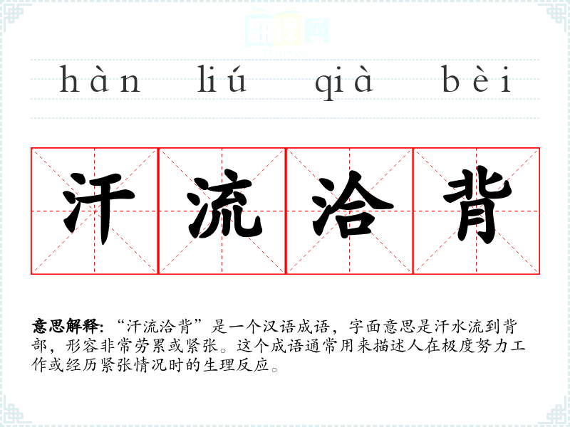 在英语中,类似的表达可能是“sweating buckets”或“dripping with sweat”,都用来形容大量出汗,但不如“汗流洽背”那样具有文化和历史的深度。