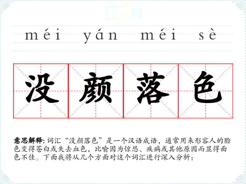 词汇“没颜落色”是一个汉语成语,通常用来形容人的脸色变得苍白或失去血色,比喻因为惊恐、疾病或其他原因而显得面色不佳。下面我将从几个方面对这个词汇进行深入分析:
