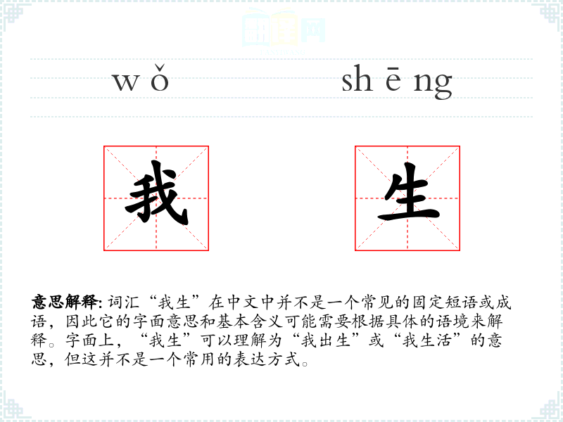 - 反义词:无(因为“我生”不是一个常用的表达,所以很难找到直接的反义词)