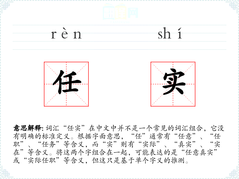 - 同义词:“任”可以对应“任意”、“任职”,“实”可以对应“实际”、“真实”。