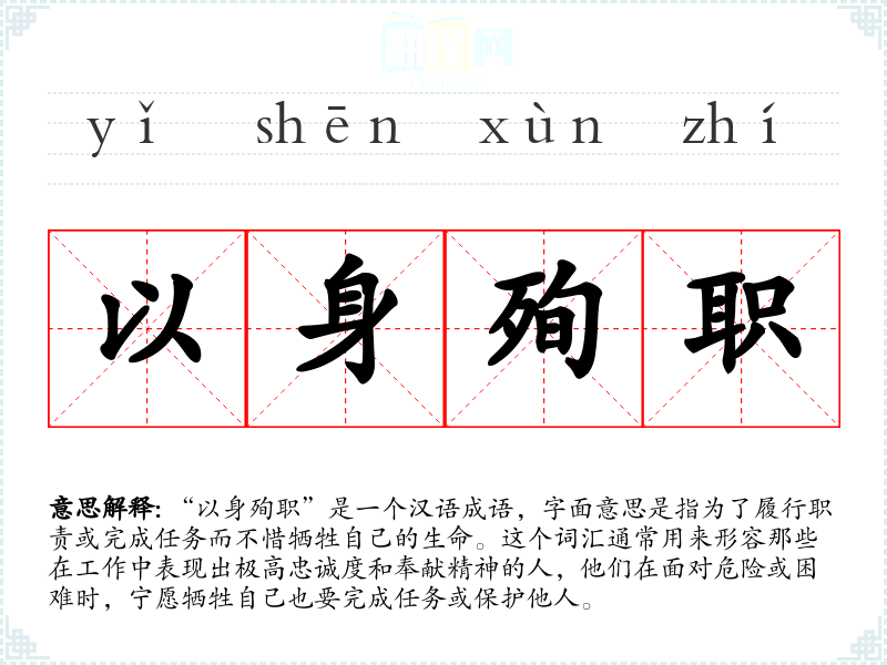 “以身殉职”这个成语源自古代汉语,其中“以身”指的是用自己的身体或生命,“殉职”则是指为了职责而牺牲。这个成语在历史上多用于描述军人和官员,随着时间的推移,其应用范围扩大到了各种职业。